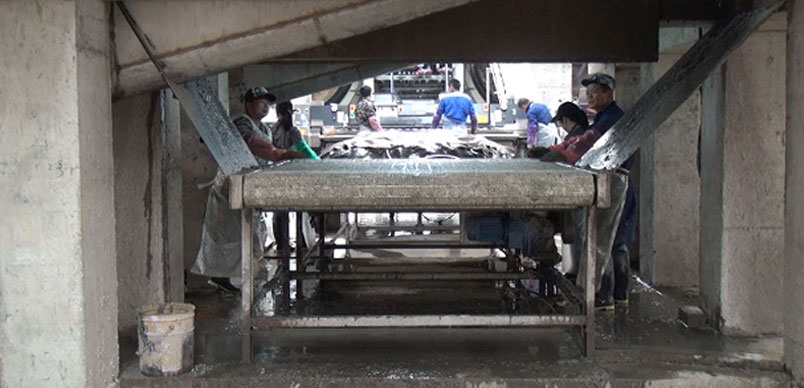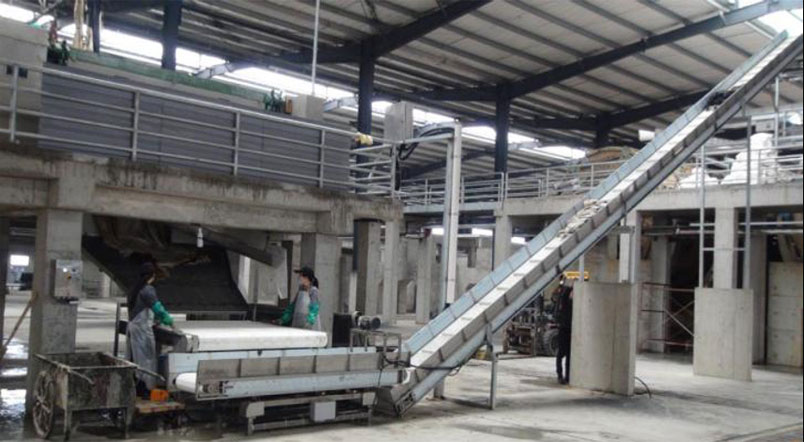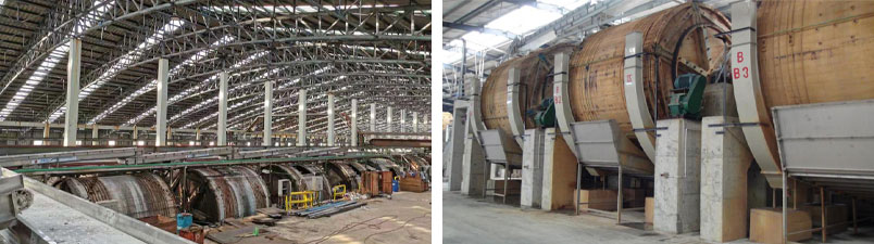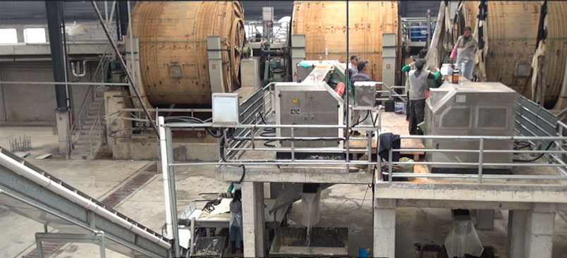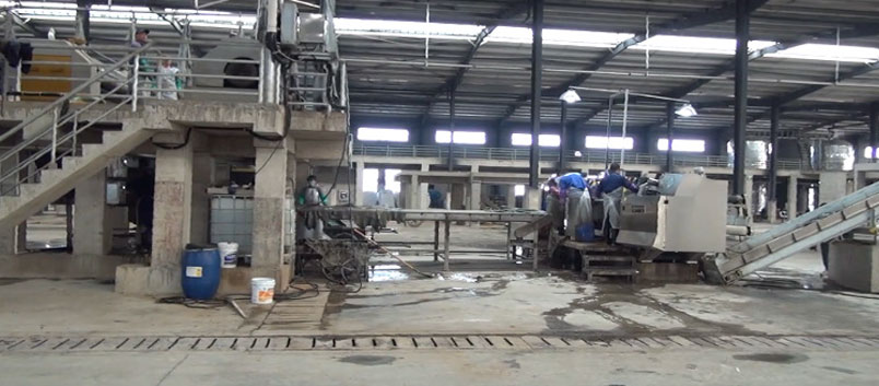 去肉后的皮張自動滑落至膨脹入鼓線上 (由于各制革廠工藝的不同,有些制革廠在此再加一個自動輸送平臺用于修邊),輸送線自動完成計重后送入到指定轉鼓浸灰膨脹;從皮張上刮下來的肉渣由肉渣輸送線送至肉渣壓水機。
