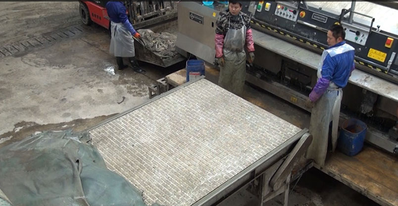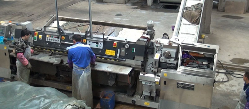 灰皮去肉后自動掉落到輸送平臺上,操作工完成對皮張的修邊和碼皮,碼整齊的灰皮被輸送至剖層機的工作臺前,操作工進行剖層皮革。