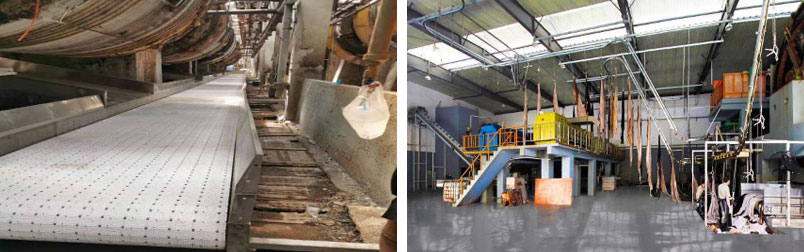 輸送帶將皮從毛皮庫直接輸送至需要投產的轉鼓,可自動稱重,到達指定重量后轉鼓鼓門關閉,輸送帶按設定的程序將皮輸送至其他轉鼓。